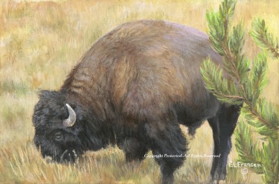An American Bison, aka Buffalo, grazes in the tall grass.