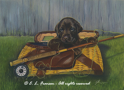 This chocolate lab puppy is in a “reel” mess of trouble! Original Sold!
