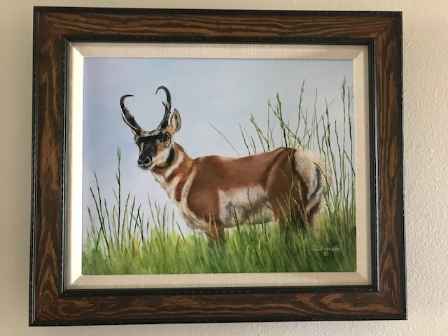 Here is a new acrylic painting titled “Looking Out Yonder.” Framing can make or break a painting and as you can see the frame totally enhances this original painting. The design mimics the stripes of the antelope’s coat and the black on the frame complements the horns.