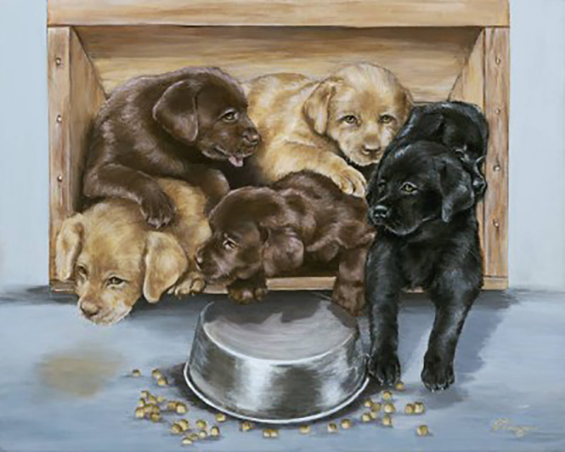 Another Labrador print for all you Lab lovers! Here are some rambunctious Labs of every color wanting some food.