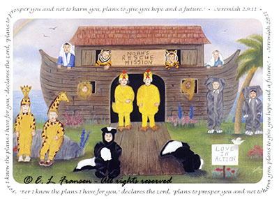 This painting is inspired by and dedicated to all God’s children. Unlike the kids in “Noah’s Rescue Mission”, many children today need the shelter of the ark – a place where they know they will be loved and cared for. Like Noah’s Mission to save his family and each animal two by two, we here on earth are called to help rescue God’s children in need.