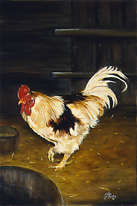 This rooster belonged to a dear neighbor who lived by the farm where I was raised. We spent a fair amount of time at Elsie’s growing up. She was pretty excited when I wanted to paint one of her roosters.