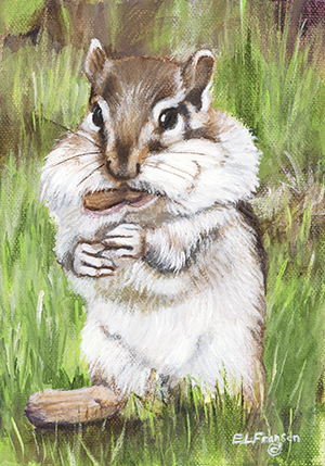 I took a bunch of photos of these little creatures stuffing their cheeks with peanuts during our fishing trip to MN in May of 2016. We (Larry & I, Riley, Kari, Emily & Parker) met up with our dear friends the Lords. The kids all had a ball feeding the chipmunks. This painting will always be a reminder of that special trip.